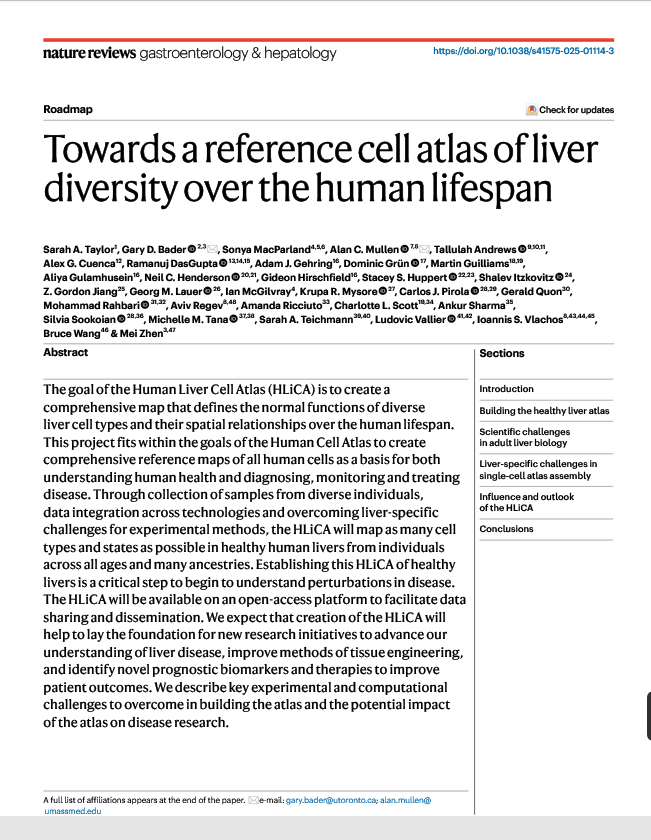 Gary Bader, Sarah Taylor, Sonya MacParland, Alan Mullen, Tallulah Andrews, Alex Cuenca, Ramanuj Dasgupta, Adam Gehring, Dominic Gruen, Martin Guilliams, Aliya Gulamhusein, Neil Henderson, Gideon Hirschfield, Stacey Huppert, Shalev Itzkovitz, Gordon Jiang, Georg Lauer, Ian McGilvray, Krupa Mysore, Carlos Pirola, Gerald Quon, Mohammad Rahbari, Aviv Regev, Amanda Ricciuto, Charlotte Scott, Ankur Sharma, Silvia Sookoian, Michele Tana, Sarah Teichmann, Ludovic Vallier, Ioannis Vlachos, Bruce Wang, and Mei Zhen. Financiado parcialmente por “The Chan Zuckerberg Initiative”.